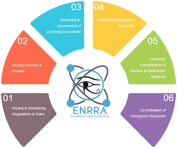 ENRRA carries out all regulatory and control works related to nuclear and radiation activities in the Arab Republic of Egypt for peaceful purposes, to ensure the security and safety of humans, property, and the environment from the harmful effects of ionizing radiation.